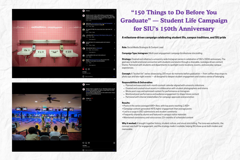 At SIU, I led high-impact social strategy and creative content production across Instagram, TikTok, YouTube, and Facebook — driving platform growth, brand voice development, and student-first storytelling at scale. I partnered with our team to launch SIU’s first TikTok presence, increased Instagram followers by 5,000+ organically, and built campaign frameworks that turned everyday moments into meaningful engagement.